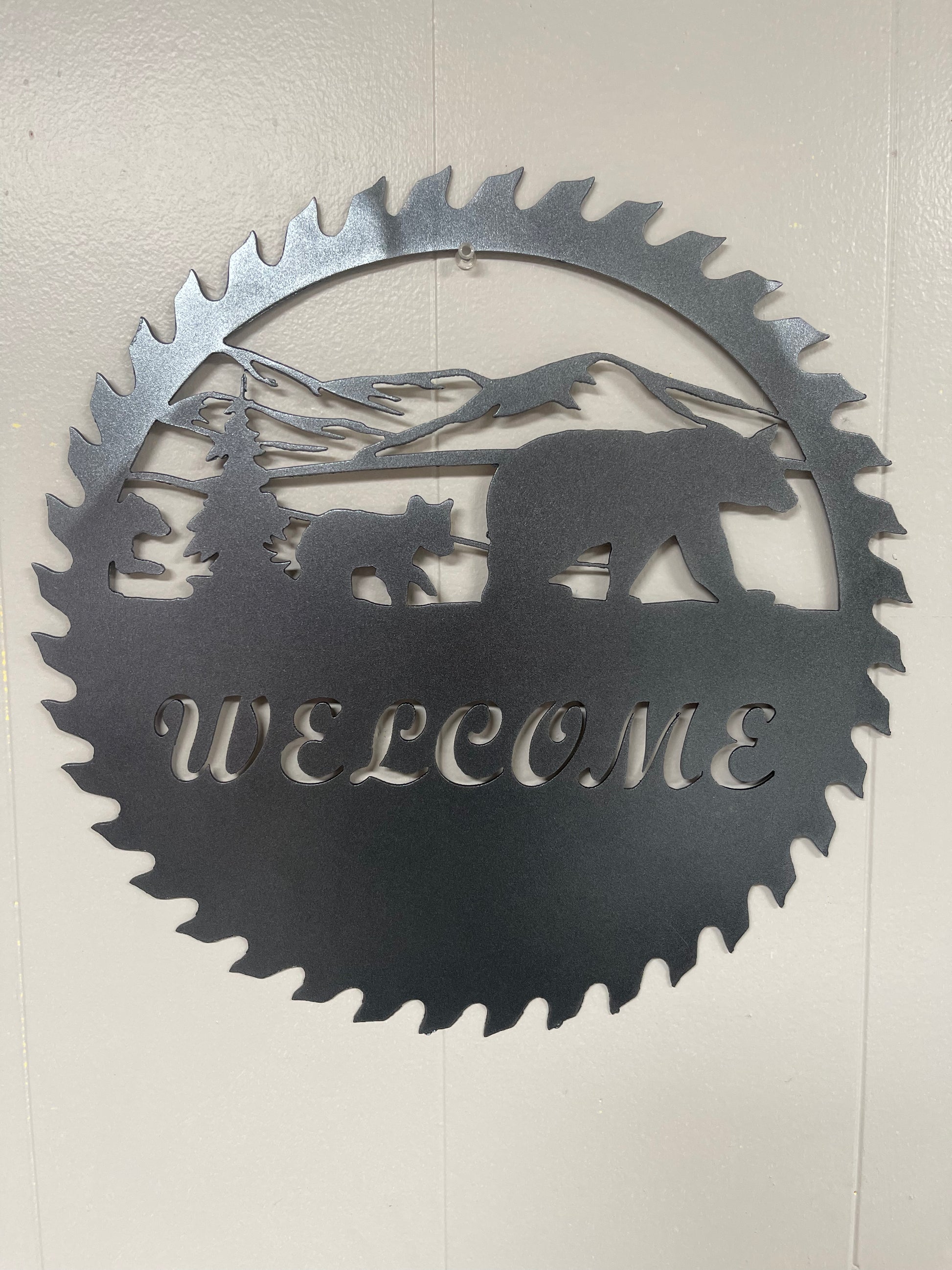 Great welcome sign with saw blade border paired with bears and mountain landscape. Text is customizable upon request. Comes satin black powder coated other colors available.